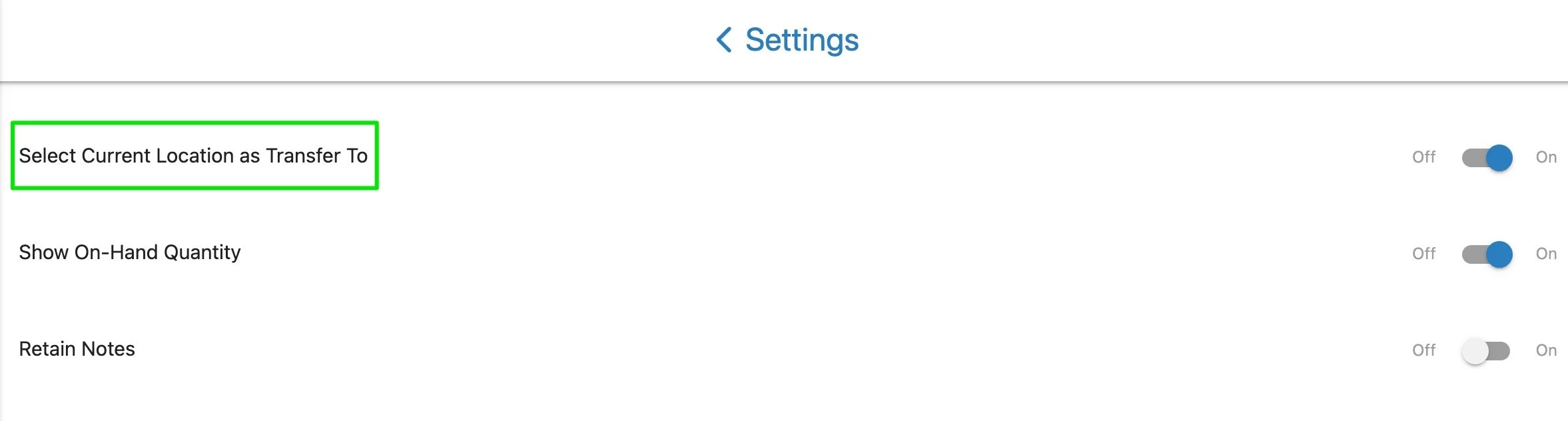 iVUE - New Setting Option for Sublocation Items - A new setting has been added to the Settings module. “Select Current Location as Transfer To” is now available. When turned “On” the “Transfer To” location will default in the Item Transfer screen to the user’s current location for any items that have a sublocation. For items without sublocations there is no impact from the setting.
